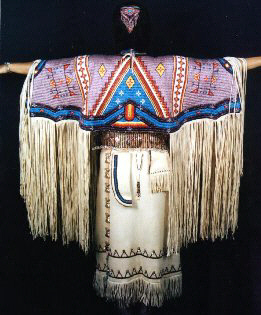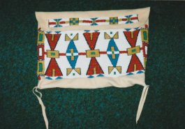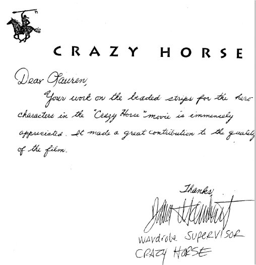 We provided the beadwork on all of the stars outfits and most of the props in the television movie “Crazy Horse.” We also dressed the stunt men, in fact, one of the bow cases for the stunt men had the design upside down because we had to make that bow case in about 12 hours from start to finish. We received a thank you letter from the production company even though we were not listed in the movie credits. We dressed Crazy Horse, Little Big Man, Sitting Bull, Crazy Horse’s wife, and two other main characters.